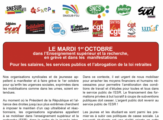 Communiqué intersyndical ESR – Le mardi 1er octobre dans l’Enseignement supérieur et la recherche, en grève et dans les manifestations Pour les salaires, les services publics et l’abrogation de la loi retraites