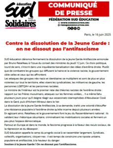 SUD éducation dénonce fermement la dissolution de la Jeune Garde Antifasciste annoncée par Bruno Retailleau à l'issue du conseil des ministres du jeudi 12 juin. Ce choix politique, lourd de sens, s’inscrit dans une inquiétante banalisation des idées d’extrême droite. Plutôt que de combattre les groupes qui diffusent la haine et la violence raciste, le gouvernement cible celles et ceux qui les affrontent.