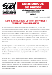SUD éducation appelle tous les personnels de l’Éducation nationale et de l’Enseignement supérieur et de la Recherche à se mettre massivement en grève le 18 septembre et à participer aux assemblées générales pour discuter des suites du mouvement.