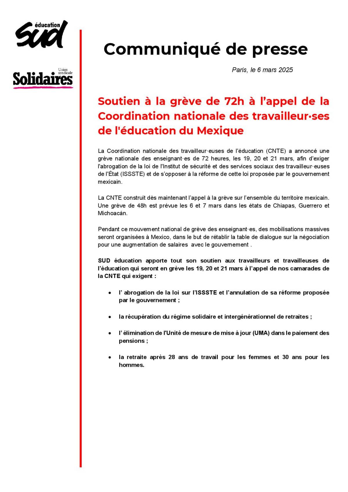 La Coordination nationale des travailleur·euses de l'éducation (CNTE) a annoncé une grève nationale des enseignant·es de 72 heures, les 19, 20 et 21 mars, afin d'exiger l'abrogation de la loi de l'Institut de sécurité et des services sociaux des travailleur·euses de l'État (ISSSTE) et de s’opposer à la réforme de cette loi proposée par le gouvernement mexicain.