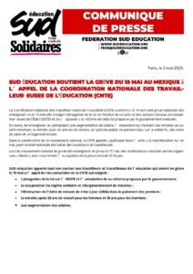 SUD éducation apporte tout son soutien aux travailleurs et travailleuses de l’éducation qui seront en grève le 15 mai à l’appel de nos camarades de la CNTE qui exigent :