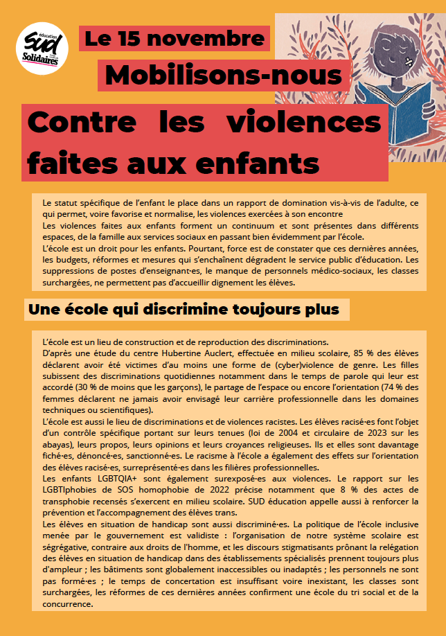 SUD éducation appelle à participer à toutes les mobilisations pour la journée des droits des enfants du 20 novembre et notamment aux manifestations le 15 novembre.