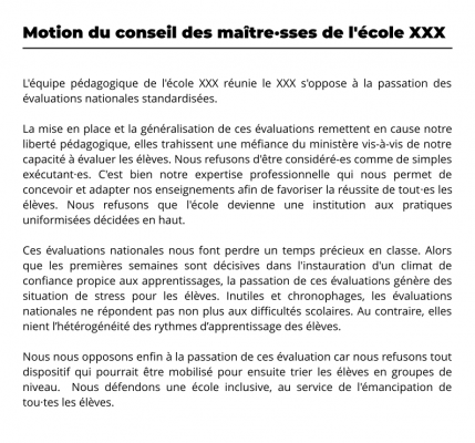 Motion de conseil des maître·sses contre les évaluations nationales