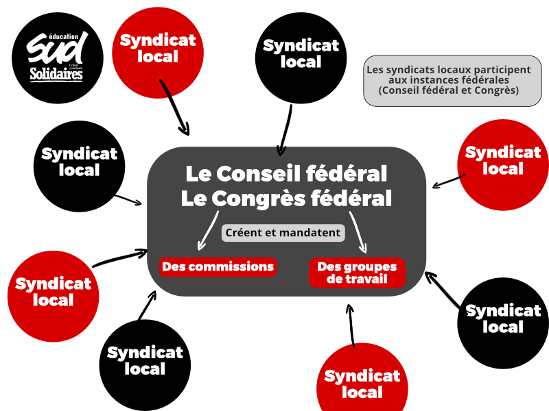 SUD éducation est une fédération de syndicats départementaux et pluri-départementaux qui couvrent l’ensemble du territoire. Chaque syndicat local s’organise démocratiquement et contribue à déterminer l’action de la fédération, notamment via le Conseil fédéral.