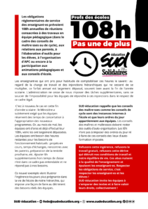 Les obligations réglementaires de service des enseignant·es prévoient 108h annuelles de réunions consacrées à des travaux en équipe pédagogique (dans le cadre des conseils de maître·sses ou de cycle), aux relations aux parents, à l'élaboration d'outils pour les élèves, à l'organisation d'APC ou encore à la participation aux animations pédagogiques et aux conseils d'école.