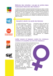 La réforme des retraites a largement pénalisé les femmes car celles-ci ont des carrières plus hachées, des salaires plus bas et travaillent davantage à temps partiel, les écarts de pension sont de 38% en moyenne entre les hommes et les femmes. La forte mobilisation sociale a contraint le gouvernement à réouvrir le dossier des retraites : nos organisations syndicales dénoncent les injustices envers les femmes qu’ont constitué les réformes des retraites de 2003 et de 2023.