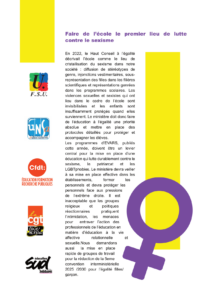 Les programmes d’EVARS, publiés cette année, doivent être un levier central pour la mise en place d’une éducation qui lutte durablement contre le sexisme, le patriarcat et les LGBTphobies. Le ministère devra veiller à sa mise en place effective dans les établissements, former les personnels et devra protéger les personnels face aux pressions de l’extrême droite. Il est inacceptable que les groupes religieux et politiques réactionnaires pratiquent l’intimidation, les menaces pour entraver l’action des professionnels de l’éducation en matière d’éducation à la vie affective relationnelle et sexuelle.Nous demandons aussi la mise en place rapide de groupes de travail pour la rédaction de la 5eme convention interministérielle 2025 /2030 pour l’égalité filles/garçon.