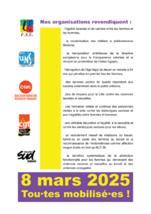 Nos organisations FSU, UNSA éducation, CFDT Éducation Formation Recherche Publiques, CGT éduc’action et SUD éducation appellent à faire du 8 mars une grande journée de mobilisation féministe, y compris par la grève, dans le secteur de l’éducation. Nos organisations syndicales sont solidaires de tou·tes celles et ceux qui à travers le monde luttent contre le patriarcat. Face à la montée constante de l'extrême droite, il est également crucial de se mobiliser contre la progression des idéologies masculinistes qui menacent nos droits et contre le fémonationalisme qui détourne nos luttes à des fins xénophobes, racistes et LGBTphobes.