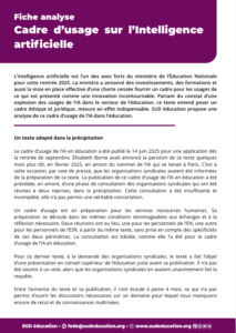 Le cadre d’usage de l’IA en éducation a été publié le 14 juin 2025 pour une application dès la rentrée de septembre. Élisabeth Borne avait annoncé la parution de ce texte quelques mois plus tôt, en février 2025, en amont du sommet de l’IA qui se tenait à Paris. C’est à cette occasion, par voie de presse, que les organisations syndicales avaient été informées de la préparation de ce texte. La publication de ce cadre d’usage de l’IA en éducation a été précédée, en amont, d’une phase de consultation des organisations syndicales qui ont été réunies à deux reprises, dans la précipitation. Cette consultation a été insuffisante et incomplète, elle n’a pas permis une véritable concertation.