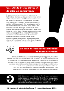 À aucun moment l’administration ne questionne la légitimité des résultats aux évaluations nationales comme seul et unique indicateur des difficultés rencontrées par des écoles. SUD éducation s’oppose depuis 2018 à leur mise en place. Chronophages, anxiogènes, normatives, sexistes, validistes, hors-sol, elles ne sont pas un outil au service des intérêts des personnels et des élèves : elles sont un outil à visée statistique, permettant de mieux légitimer les injonctions normatives de notre hiérarchie et, in fine, de trier les élèves. Elles sont aussi un outil de mise en concurrence généralisée. Dans les formations des enseignant·es ou dans les réunions de directeurs et directrices, les tableaux comparatifs des écoles, circonscriptions et départements se multiplient. Cette vision va à l’encontre de l’essence même du service public d’éducation qui prône pourtant la bienveillance.