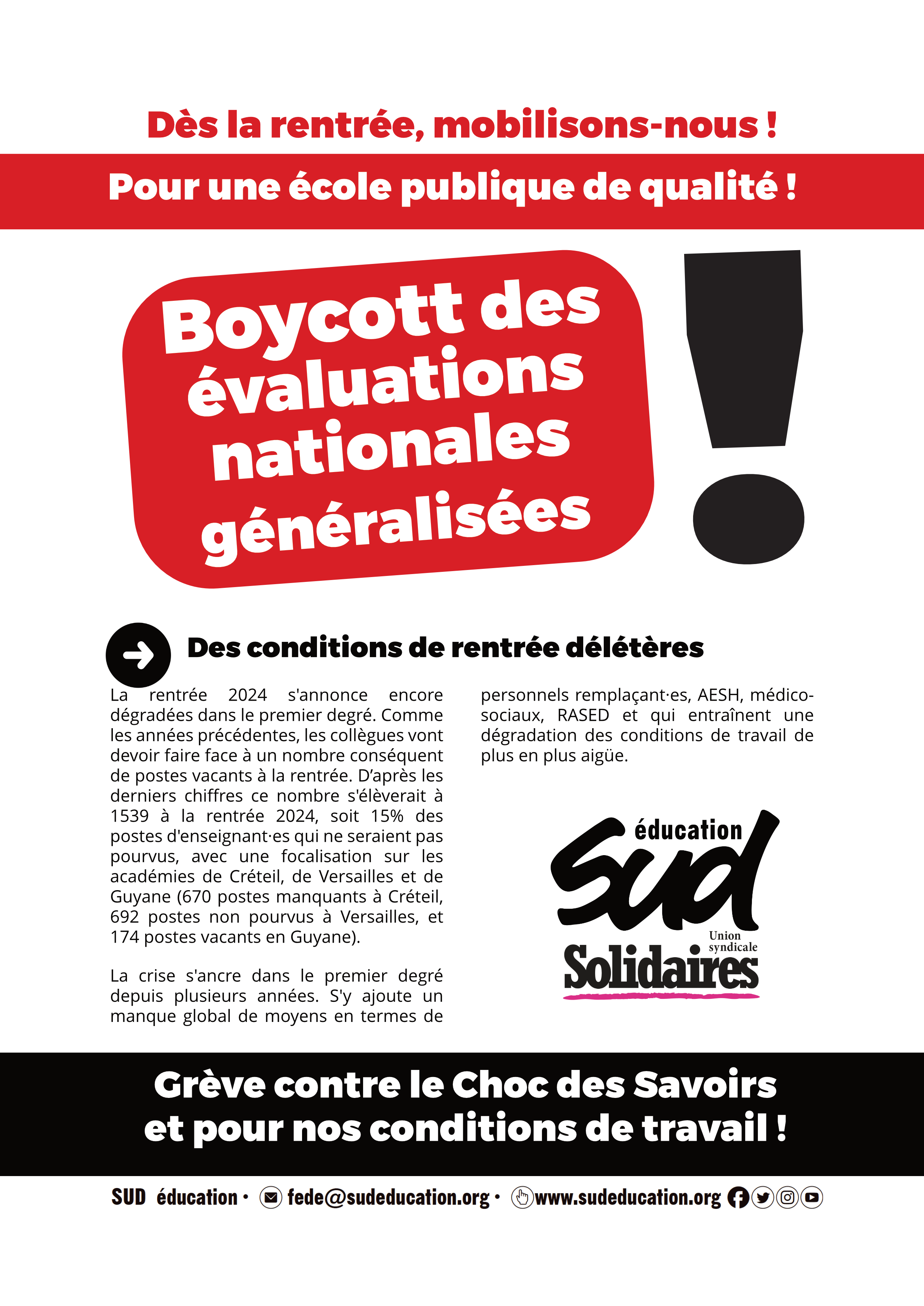 Grève contre le choc des savoirs et pour nos conditions de travail ! Boycott des évaluations nationales généralisées !
