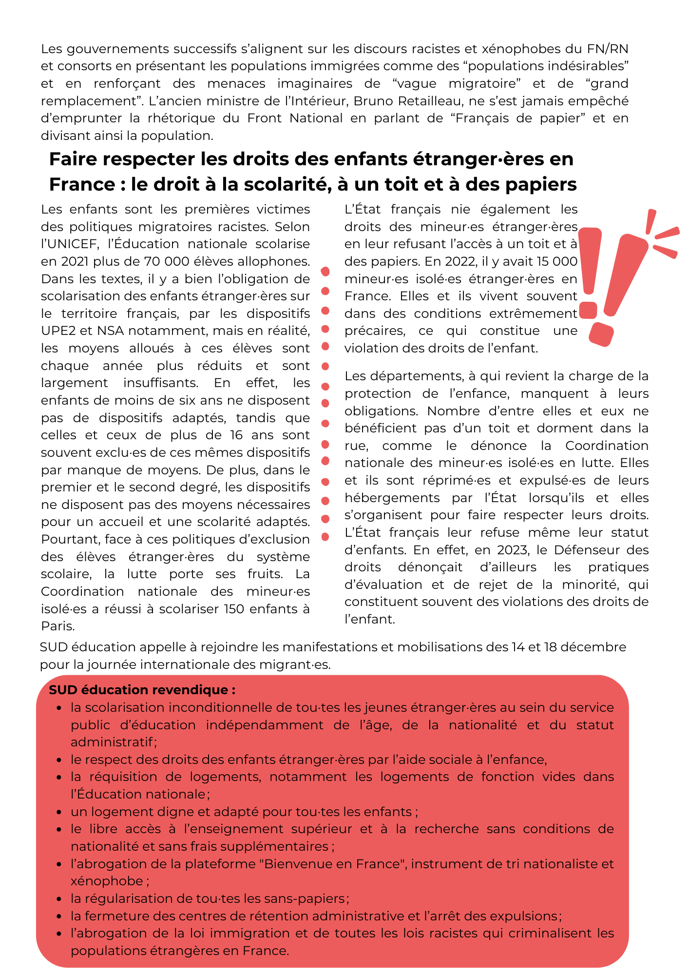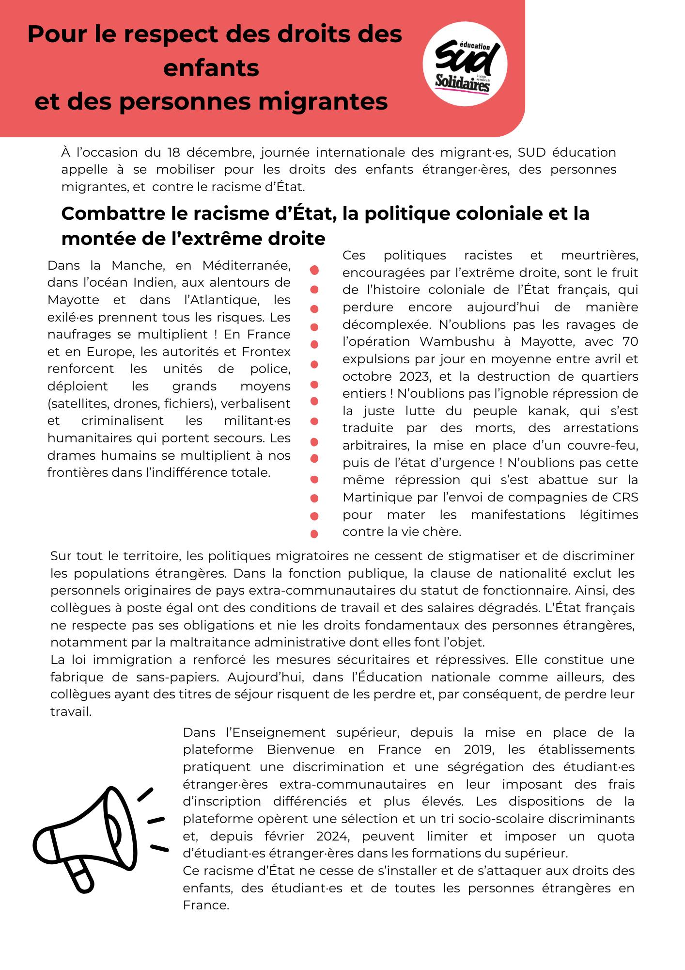 À l’occasion du 18 décembre, journée internationale des migrant·es, SUD éducation appelle à se mobiliser pour les droits des enfants étranger·ères, des personnes migrantes, et contre le racisme d’État.