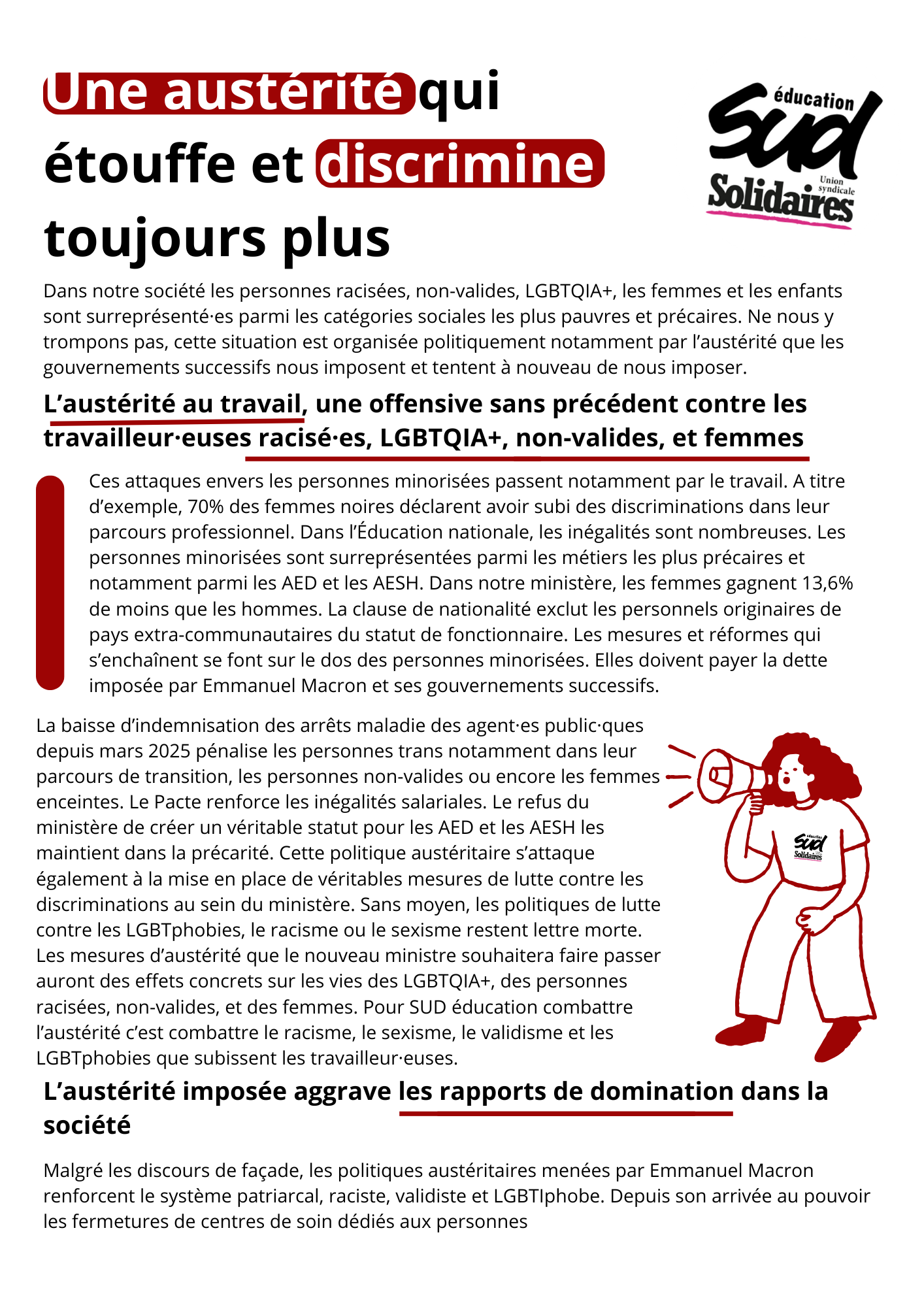 Les mesures d’austérité que le nouveau ministre souhaitera faire passer auront des effets concrets sur les vies des LGBTQIA+, des personnes racisées, non-valides, et des femmes. Pour SUD éducation combattre l’austérité c’est combattre le racisme, le sexisme, le validisme et les LGBTphobies que subissent les travailleur·euses.