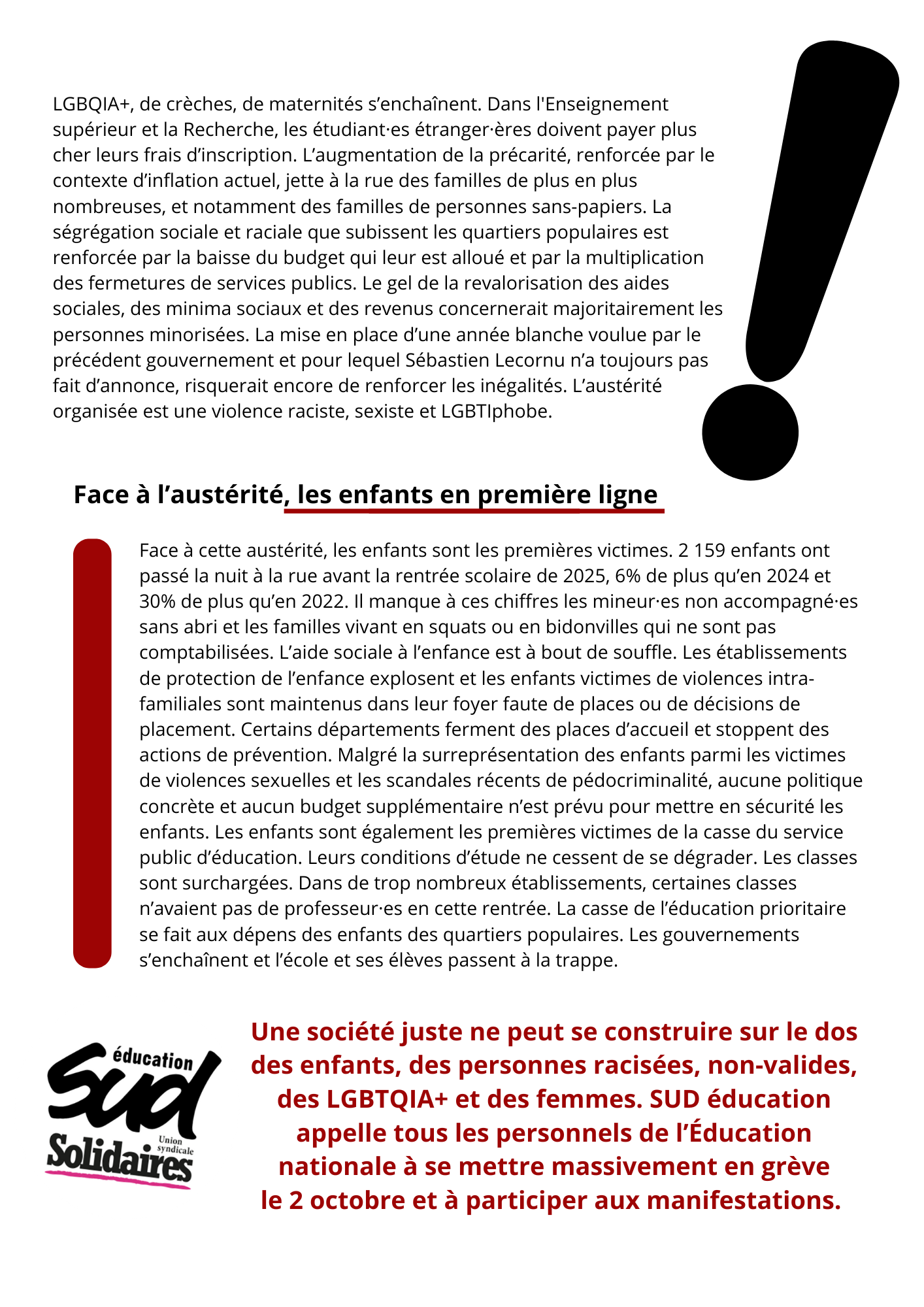 Une société juste ne peut se construire sur le dos des enfants, des personnes racisées, non-valides, des LGBTQIA+ et des femmes. SUD éducation appelle tous les personnels de l’Éducation nationale à se mettre massivement en grève le 2 octobre et à participer aux manifestations.