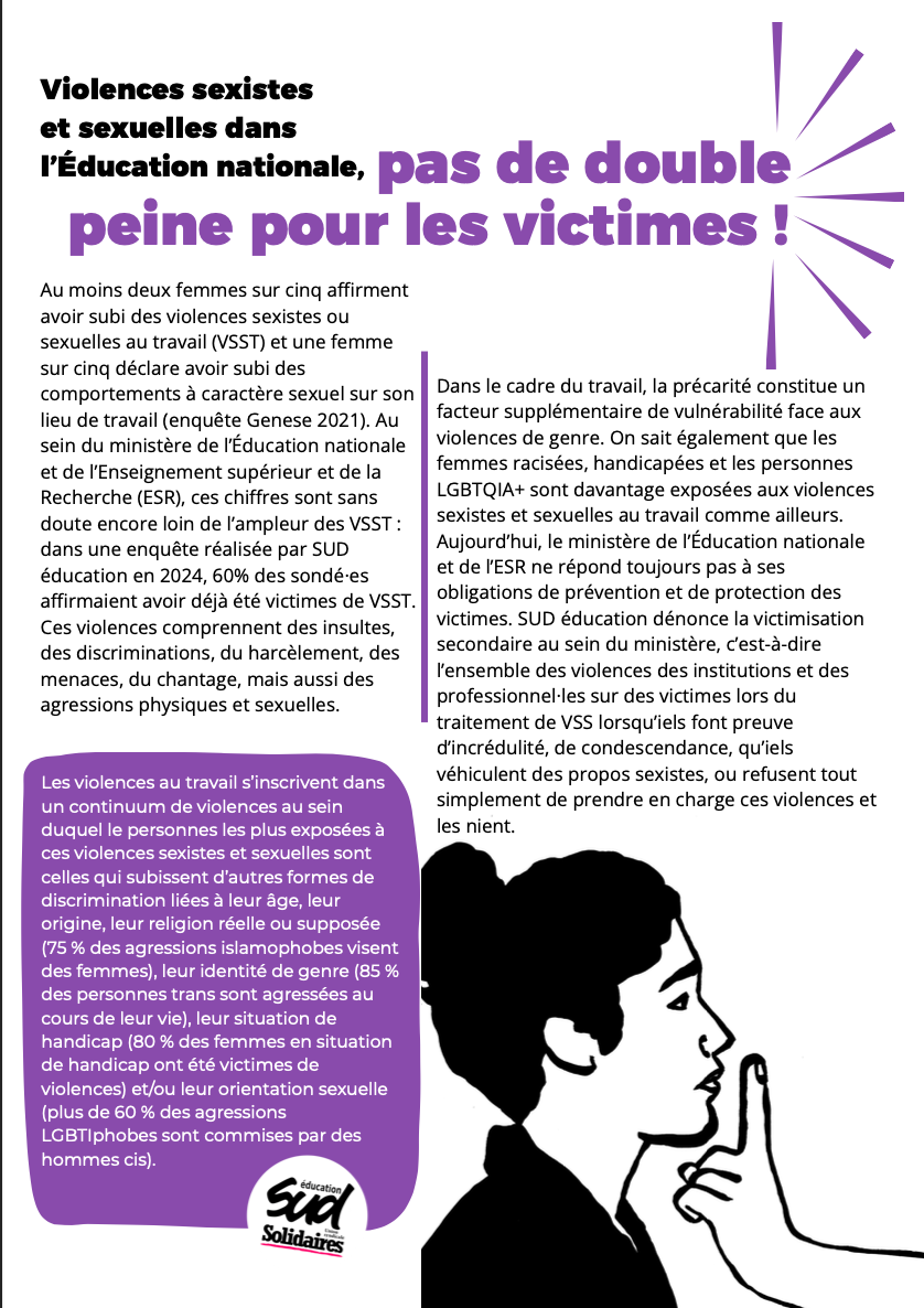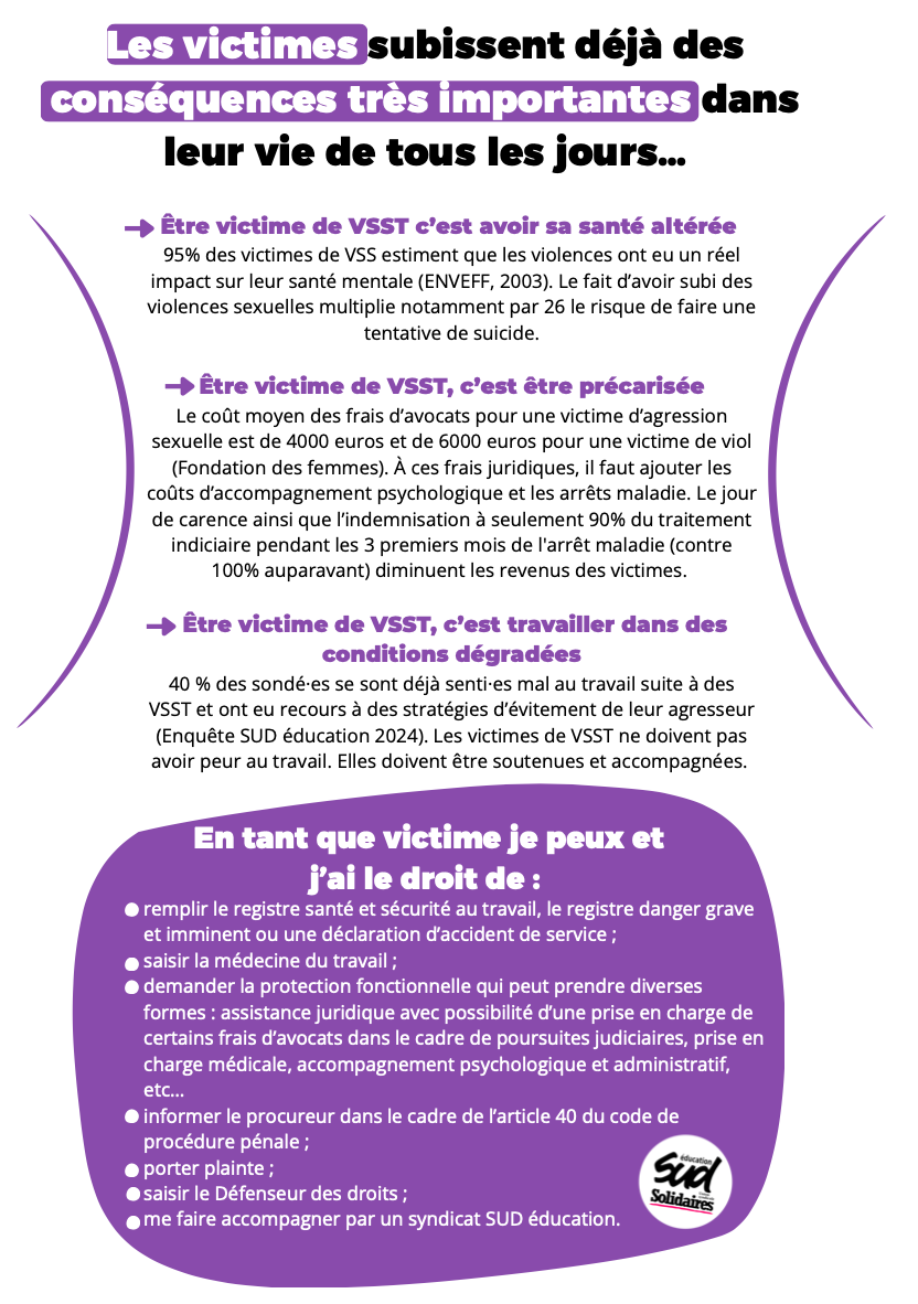 SUD éducation accompagne régulièrement des victimes dont les droits ne sont pas respectés. Certaines victimes doivent continuer à travailler avec leur agresseur. D’autres ont dû prendre en charge leurs frais juridiques après avoir été agressées sur leur lieu de travail. Ces comportements participent à maintenir l’omerta sur les violences sexistes et sexuelles et à faire taire les victimes. Trop de collègues doivent se mettre en arrêt maladie pour ne plus avoir à supporter des conditions de travail dégradées suite à des VSST. Ces violences et ces manquements sont d’autant plus forts quand les victimes sont des personnes LGBTQIA+, racisées ou handicapées.
