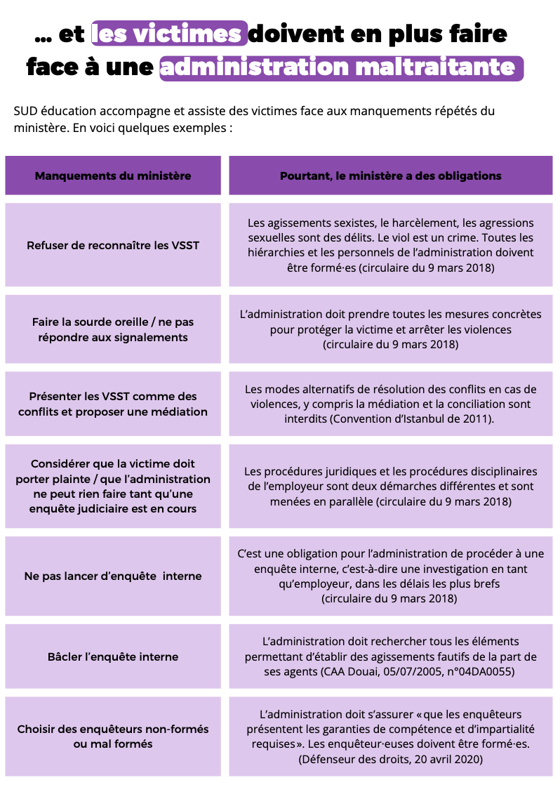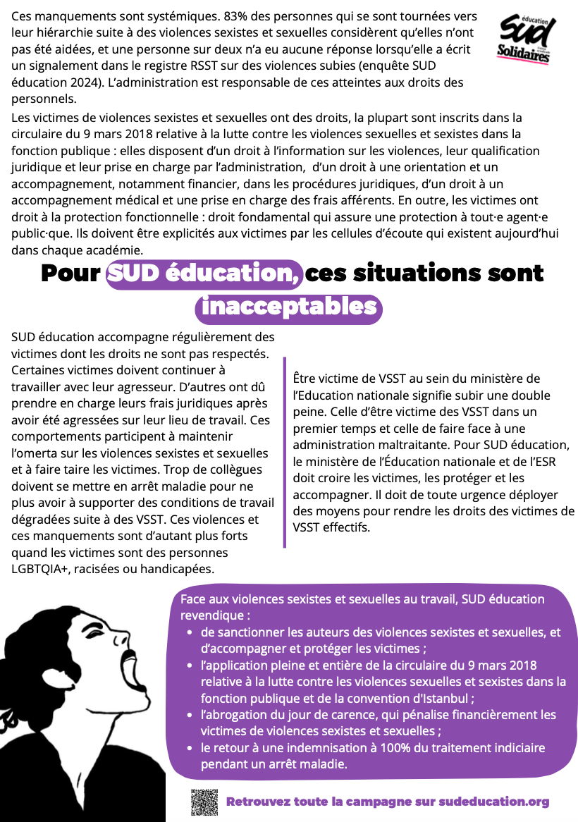 Ces manquements sont systémiques. 83% des personnes qui se sont tournées vers leur hiérarchie suite à des violences sexistes et sexuelles considèrent qu’elles n’ont pas été aidées, et une personne sur deux n’a eu aucune réponse lorsqu’elle a écrit un signalement dans le registre RSST sur des violences subies (enquête SUD éducation 2024). L’administration est responsable de ces atteintes aux droits des personnels.